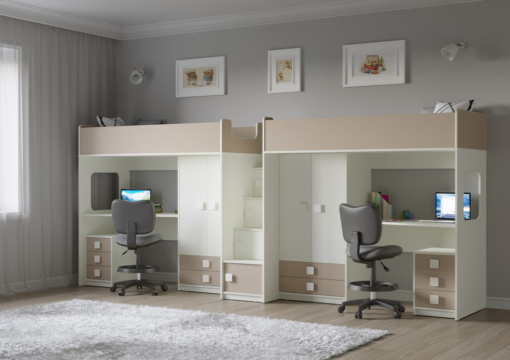Две кровати, два шкафа, две рабочих зоны с тумбами – одна лестница. Идеальный вариант для двоих детей!