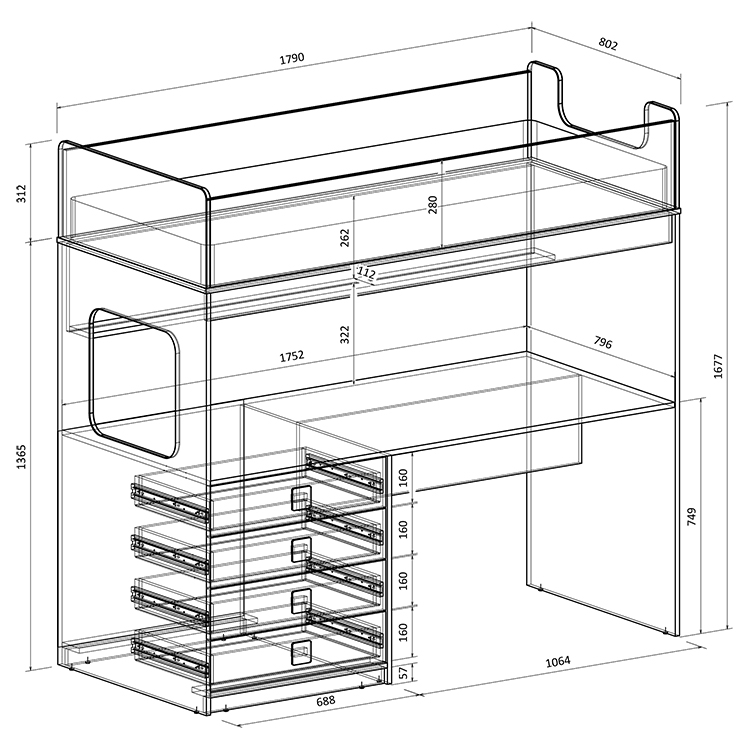 Учебная зона со столом под спальным местом открывает возможности для письменных работ,а также здесь удобно расположить ноутбук.