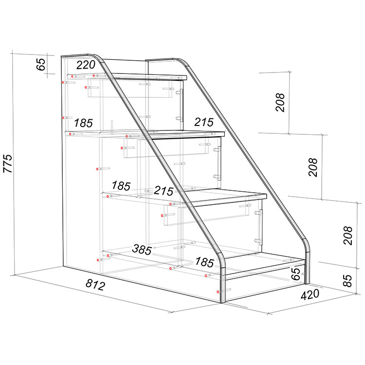 Высота кровати – 86см от пола, 105см вместе с бортиками. Родителям будет легко и удобно наблюдать за малышом, нетрудно заправлять кровать.